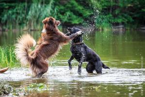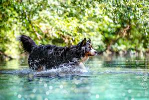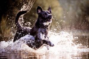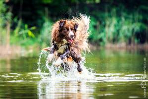 Natürlich sollte Euer Vierbeiner Spaß am Wasser haben, das er auch schwimmt ist aber nicht nötig! Die schöneren Bilder entstehen beim Toben im seichten Wasser.